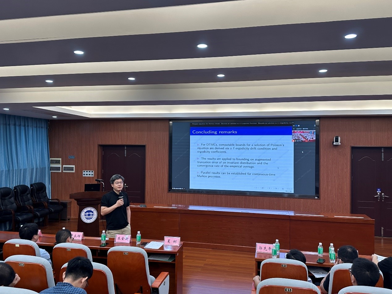 研讨会上,吴晓院长对各位专家学者的到来表示热烈的欢迎。他介绍了本次会议的筹办情况、召开背景及意义、学院当前基本情况。天津大学邵井海教授、中南大学刘源远教授、湖南师范大学朱全新教授、曲阜师范大学孙中洋教授、北京师范大学(珠海校区)廖仲威、广东工业大学卢相刚副教授等作了主旨报告。中山大学郭先平教授、夏俐教授、张俊玉副教授、黄永辉副教授、郭昕助理教授,分别就随机过程和随机博弈的最新理论成果及其应用、概率统计与其它学科交叉融合研究等专题作了汇报交流。本次会议对推动随机控制及其应用的研究与发展、推进统计学与其他学科的交叉融合等都起到了很好地促进作用。