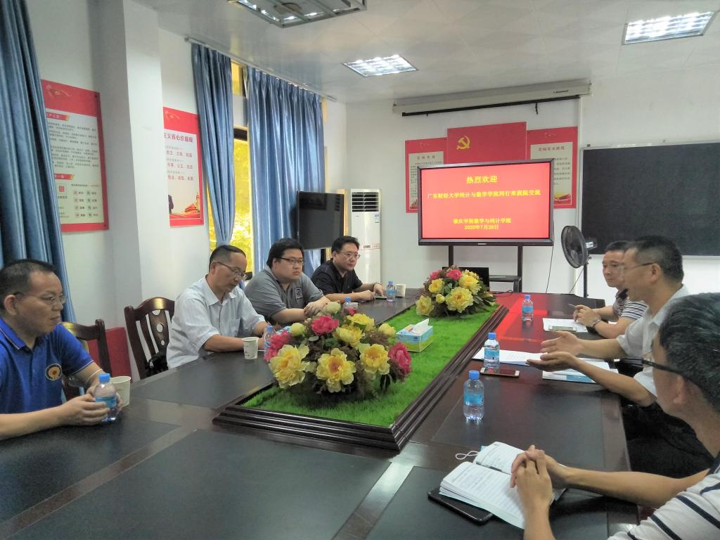 朱院长向客人介绍了我院在学科建设、专业建设、学科竞赛等方面工作开展情况。黄辉副院长分享了广东财经大学近年来在人才培养、数学建模培训、学生考研等方面经验。