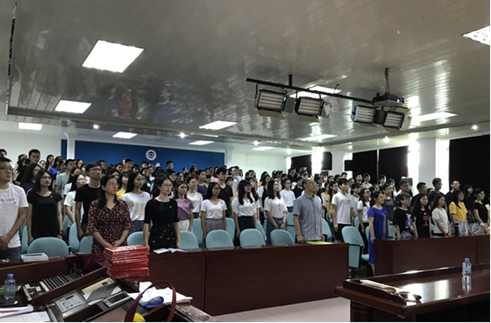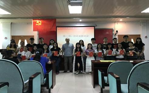 6 月 25 日中午 ,学院党委在行政楼第二会议室举行了新党员入党宣誓暨“七一”党员教育表彰大会。出席本次大会的有学院党委书记杨帆、副书记高洁云、各党支部书记和全体学生党员,共 200 余人。