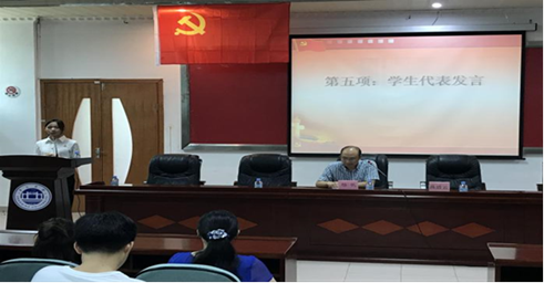 会议第五项议程,由学生党员代表陈秋丽、章春蓉、陈嘉敏、方少锋四位同志依次上台进行发言。陈秋丽同志介绍了自己的学生工作、参赛等经历,并倡导大家时刻以合格党员的标准严格要求自己;章春蓉同志就自己大学四年的学习生活,主要是自己的工作经历做了个总结,为大家提供了许多宝贵的意见;陈嘉敏同志就“纯粹”展开了自己的演讲,在她看来,为人民服务、为同学服务并没有如此的沉甸,做好身边的小事就是一种服务;而方少锋同志作为 18 级的当班党员,给自己提出了要求,希望自己能更好地为师弟师妹们服务,同时也希望自己能在未来的带班工作中获得成长。