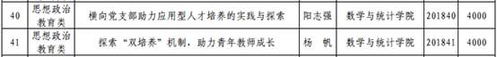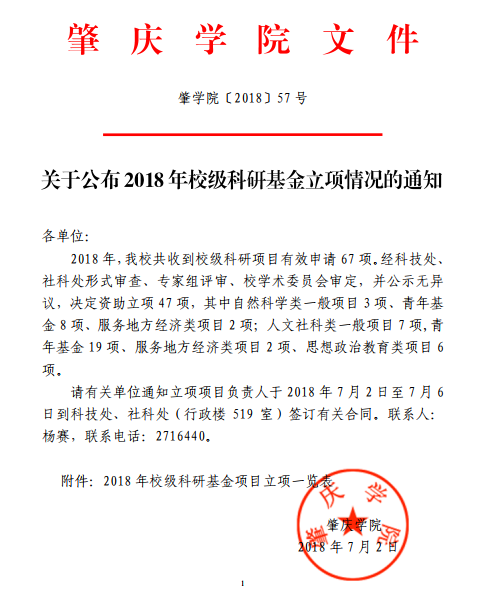 近日,学校下发了《关于公布2018 年校级科研基金立项情况的通知》 (肇学院[2018]57 号)。在校级思想政治教育类项目立项的 6 个项目中,我院占了 3个项目。此次校级思政项目申报工作,得到了学院党委的高度重视,专门召开了立项申报动员会,组织全体学工队伍共同参与,经过努力,实现了思政立项的新突破。