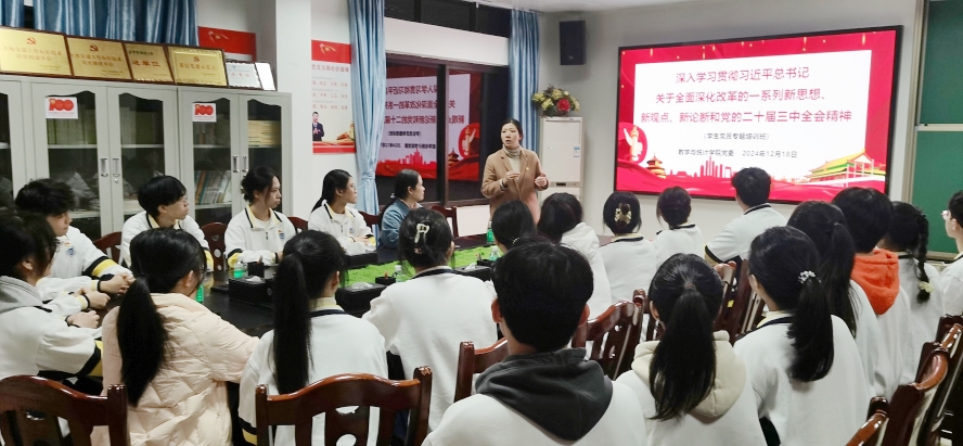 12月18日,数学院党委组织学生党员深入学习贯彻习近平总书记关于全面深化改革的一系列新思想、新观点、新论断和党的二十届三中全会精神活动,同时开展了2024年下半年新发展党员入党宣誓仪式。学院党委副书记高洁云,专职组织员汤瑞雪,以及全体学生党员参加本次活动。