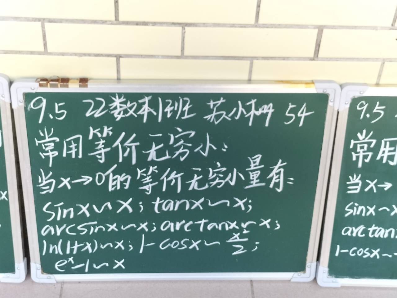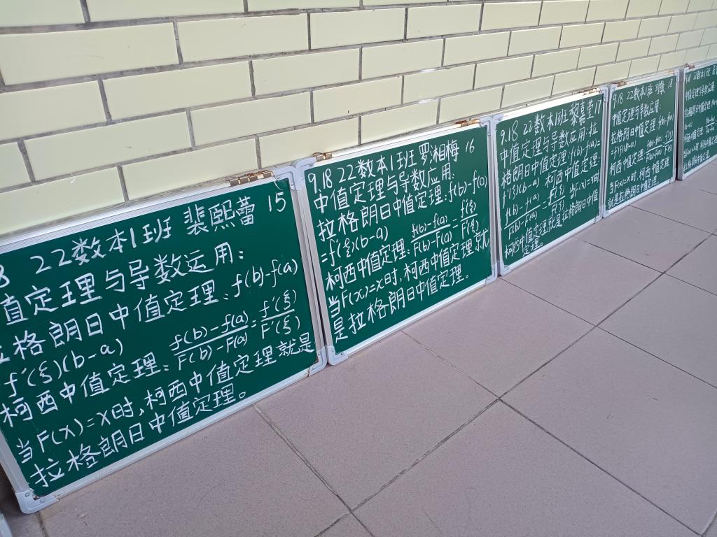 新学期的第一天,我院大一、大二师范生粉笔字书写晨检工作已有序开展。在第二教学楼二楼,一块块小黑板上展示几行整齐规范的数学知识点,不仅展示了师范生们的书写风范,也营造了良好的学习氛围。