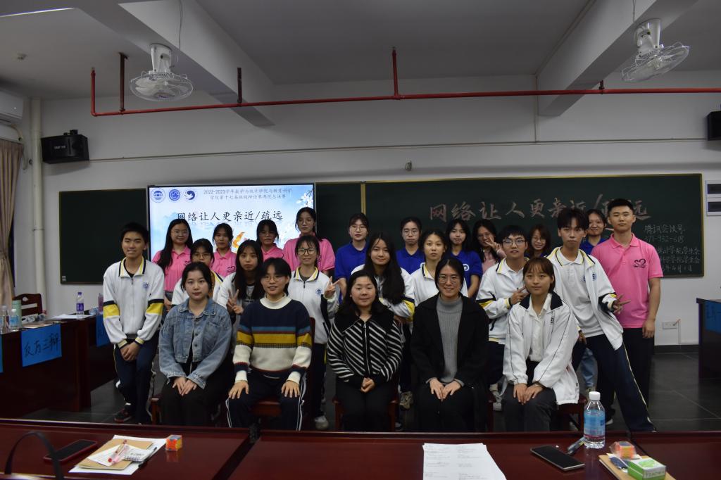 教科院的22应心2班与我院22信息班进行了两院总决赛,教科院团委书记刘瑞雪和我院团委书记潘敏仪出席了本场辩论赛。总决赛辩题为“网络让人更亲近/疏远”。正反方都引用了亲身经历以及日常生活对辩题进行诠释,其中正方三辩22应心2班郑宗煜提出的观点“不管使用网络与否,只有与人交流产生的心灵沟通、灵魂碰撞,才能使得人与人之间变得亲近。”得到观众与评委的一致认可,同时他也赢得了最佳辩手和人气辩手的称号。最终22应心2班取得总冠军。在点评环节,我院团委书记潘敏仪给出意见和建议,提出双方辩手对辩题把握不够准确的问题,希望他们加深对辩题的理解,备赛要查找真实数据用于辩论。
