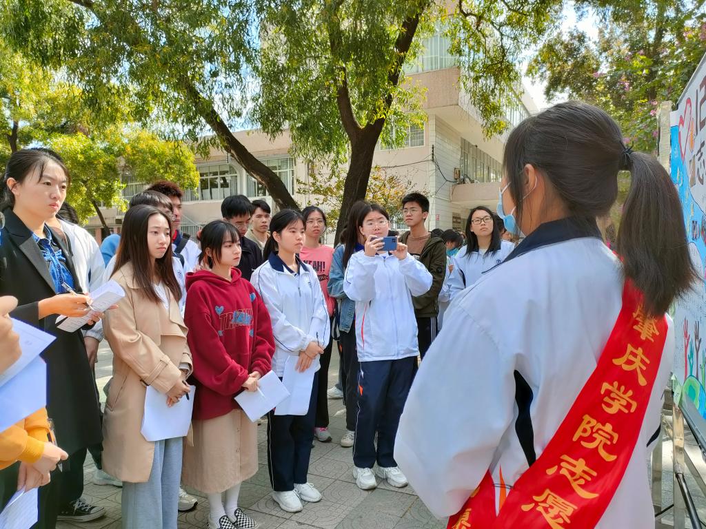 活动以“看、讲、听”的形式进行,讲解员以“活动介绍”、“部门介绍”、“展板的构图元素”、“创意想法”四部分向评委老师和观众们展开讲解。在讲解过程中,我们着重介绍我院特色志愿活动及青年云支教,以此吸引更多青年参与志愿服务,壮大青年云支教的队伍。除此之外,我们还设有志愿常识和党史问答环节,加深砚园师生对党史以及志愿精神的了解。