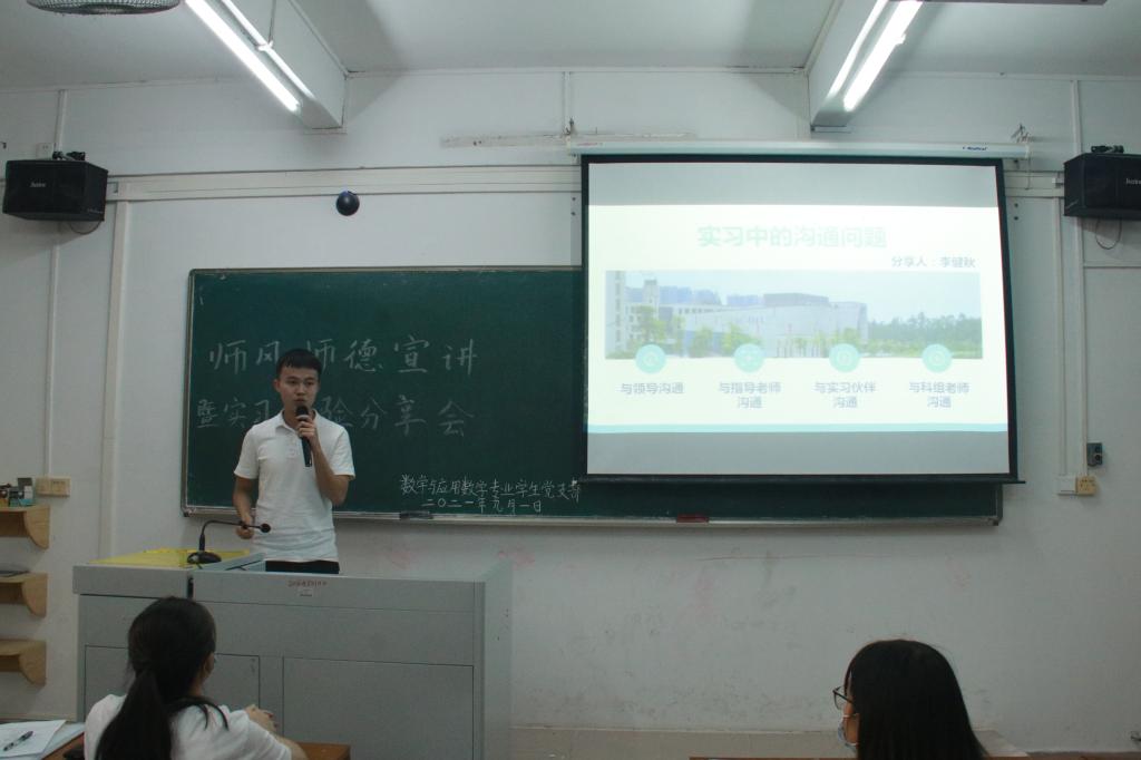 2021年9月1日下午15:00数学与应用数学专业学生党支部在一教202课室举行师德师风宣讲暨实习经验分享会。此次会议,共有46名支部成员和部分学生代表参加,会议由支部代理书记潘敏仪主持。