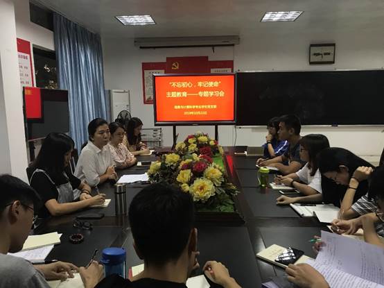 本次会议由党支部书记汤瑞雪同志主持,学院党委副书记高洁云同志全程参与了此次学习会,此次学习会主要结合《习近平关于“不忘初心、牢记使命”论述摘编》和近期党支部存在的问题进行相关的学习和工作部署。