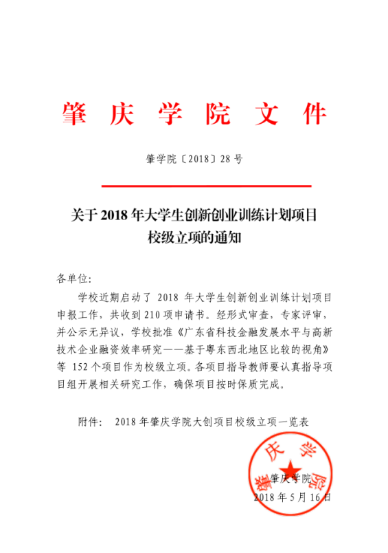 我院高度重视创新创业工作,专门成立大创项目筹备组,由学院党委牵头、积极组织引导我院师生参与创新创业项目申报。在2018年大学生创新创业训练计划项目申报工作中,我院共提交上报了16项作品,共计10名老师及90余名学生参与。近日经学校评审,我院共13个项目获得校级立项。其中由黄民海教授指导《高校校园可回收垃圾问题及其解决办法-以永利yl23411为例》及钟一兵副教授指导《对大学生心理健康调查情况分析》获得推荐申报国家级项目;钟一兵副教授指导《肇庆市工业发展对环境影响研究》、邹小林副教授指导的《肇庆府城复兴项目对肇庆旅游业影响研究》、徐勇老师指导《空间箱》共三项获得推荐申报省级项目。